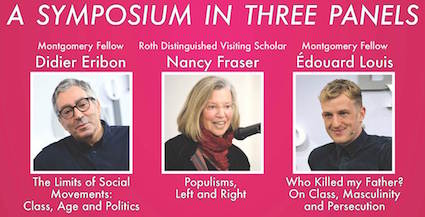 Intersectionality in the Age of Populism, a symposium in three panels on Friday, April 20, presenting Montgomery Fellow Didier Eribon, Roth Distinguished Visiting Scholar Nancy Fraser, and Montgomery Fellow Édouard Louis.